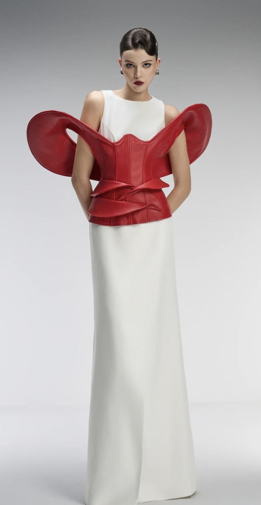 Couture Sleeveless Maxi Dress With Detachable Corset in Red-White