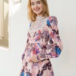 A vibrant and intricate pattern with a mix of floral and geometric designs. The base color a light pink, adorned with various shades of blue, purple, and hints of orange flowers. There are also ornate white patterns of embroidery, particularly around the neckline, waistline, and hem. The dress has long sleeves and a flared skirt that reaches about mid-thigh length. It has a fitted bodice with a waistband giving it some structure. The neckline is round and modest. Overall, it exudes a feminine and elegant vibe.