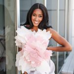A prominent floral design with oversized, layered petals in a soft pink hue that covers the bodice and extends outward. The skirt portion of the dress appears to be short and fitted, with a textured white fabric that adds contrast to the smooth, delicate appearance of the petals. Overall, it exudes a feminine and elegant vibe.